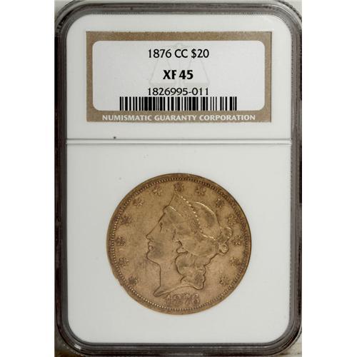 <B>1876-CC $20 XF45 NGC.</B></I> This Choice XF example displays typical circulation marks and wear for the grade, with small glints of luster still evident on the reddish tan-gold surfaces. A relatively available Carson City Mint issue.<BR><BR><b>Shipping:</b> Coins & Currency (<a target="_blank" href="http://www.heritageauctions.com/common/shipping.php">view shipping information</a>)