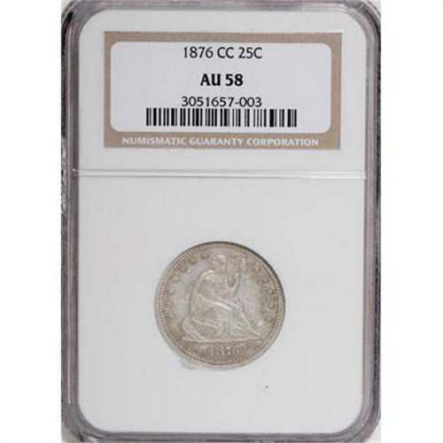 <B>1876-CC 25C AU58 NGC.</B></I> NGC Census: (22/136). PCGS Population (16/132). Mintage: 4,944,000. Numismedia Wsl. Price for NGC/PCGS coin in AU58: $240. (#5502)<BR><BR><B>Coin Engraver:</B> Christian Gobrecht<BR><BR><b>Shipping:</b> Coins & Currency (<a target="_blank" href="http://www.heritageauctions.com/common/shipping.php">view shipping information</a>)
