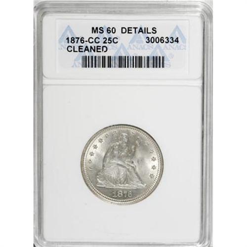 <B>1876-CC 25C --Cleaned--ANACS. MS60 Details.</B></I> NGC Census: (3/133). PCGS Population (3/125). Mintage: 4,944,000. Numismedia Wsl. Price for NGC/PCGS coin in MS60: $371. (#5502)<BR><BR><B>Coin Engraver:</B> Christian Gobrecht<BR><BR><b>Shipping:</b> Coins & Currency (<a target="_blank" href="http://www.heritageauctions.com/common/shipping.php">view shipping information</a>)