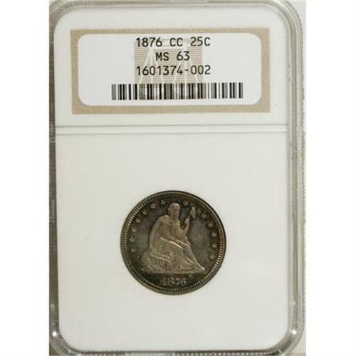 <B>1876-CC 25C MS63 NGC.</B></I> Breen-4091. Type Two Reverse. Large or Tall CC Mintmark. This is an impressive example with fully prooflike fields and light cameo contrast shining through gold, lilac, and blue toning.<BR><BR><b>Shipping:</b> Coins & Currency (<a target="_blank" href="http://www.heritageauctions.com/common/shipping.php">view shipping information</a>)