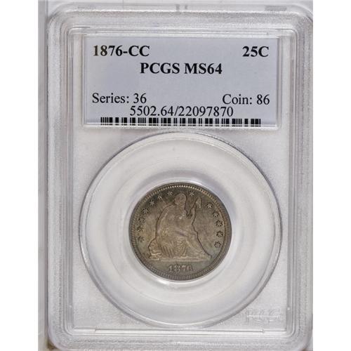 <B>1876-CC<25C> MS64 PCGS.</B></I> Quite lustrous with a typical strike for this issue. Delicate blue, lavender, and violet-gold patina covers both sides. Population: 43 in 64, 14 finer (7/06).