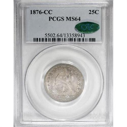 <B>1876-CC 25C MS64 PCGS. CAC.</B></I> Type Two Reverse. Well-defined overall with soft, lovely luster and attractive peach-rose and sage patina. This Carson City quarter issue, with its mintage of nearly 5 million pieces, is one of the few minor issues from that facility that is available in Mint State today. Population: 39 in 64, 14 finer (11/07).<BR><BR><B>Coin Engraver:</B> Christian Gobrecht<BR><BR><b>Shipping:</b> Coins & Currency (<a target="_blank" href="http://www.heritageauctions.com/common/shipping.php">view shipping information</a>)