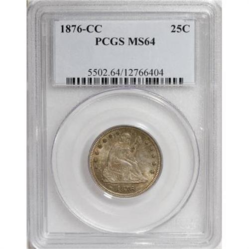 <B>1876-CC 25C MS64 PCGS.</B></I> Type One Reverse. Ample green-gold patina covers much of each side, while the centers show whispers of softer silver-gray toning. Well struck for this Carson City issue with pleasing luster and memorable visual appeal. Population: 41 in 64, 14 finer (3/08).<BR><BR><B>Coin Engraver:</B> Christian Gobrecht<BR><BR><b>Shipping:</b> Coins & Currency (<a target="_blank" href="http://www.heritageauctions.com/common/shipping.php">view shipping information</a>)