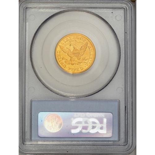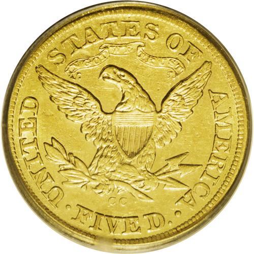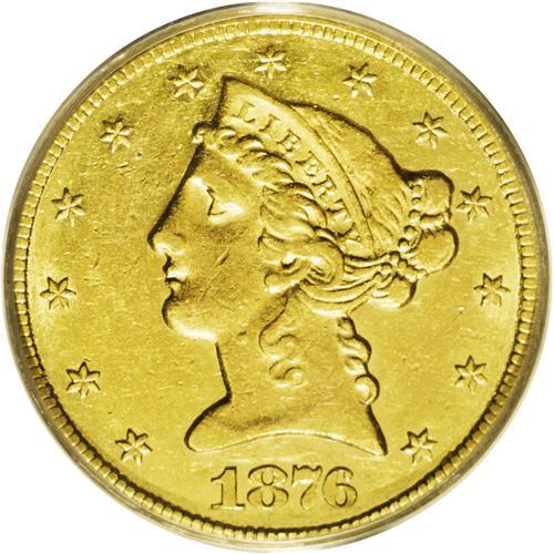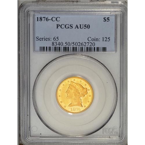 <B>1876-CC<$5> AU50 PCGS.</B></I> Variety 1-A. An especially challenging Carson City half eagle, one of a paltry 6,887 pieces struck, that is rare not only in the absolute sense, but is also a condition rarity with very few examples known above the XF grade level. Both sides of this minimally circulated example display a rich golden color and retain generous amounts of prooflike luster. The diagnostic die lump on Liberty's throat, present on all genuine '76-CC half eagles is easily visible to the unaided eye. Population: 5 in 50, 15 finer (7/06).