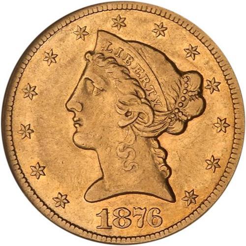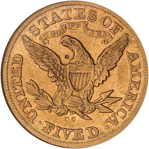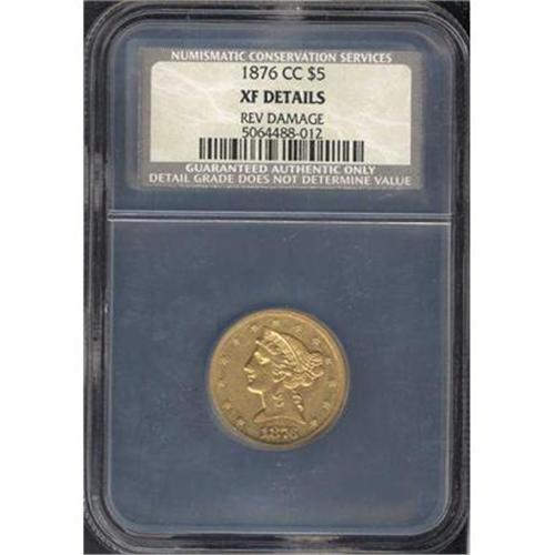 <b>1876-CC $5 Liberty. NCS graded EF Details. Reverse Damage.</b> The obverse is particularly attractive here, with smooth surfaces, some luster at the stars and providing a slight halo or aura around Liberty. Only 6,887 pieces were made. The "damage" consists of a very tiny drill hole or punch mark at the eagle's neck, that is all. Some might find this insignificant, others, no <b>(PCGS # 8340)</b>