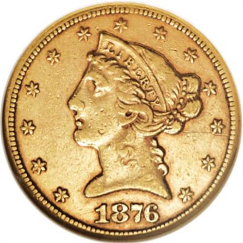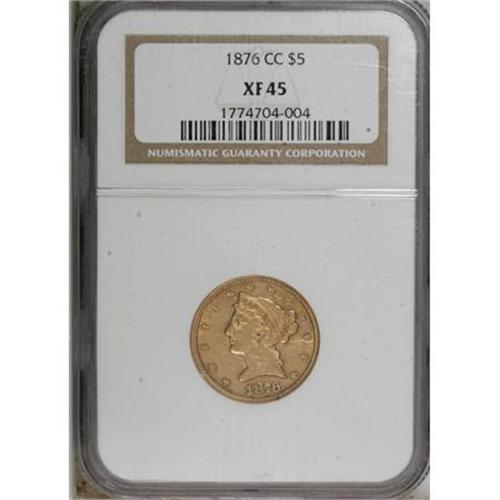 <B>1876-CC $5 XF45 NGC.</B></I> The 1876-CC has the lowest mintage figure of any Carson City half eagle. According to Douglas Winter (2001): "It is a scarce coin in all grades and the majority of survivors fall into the Very Fine--Extremely Fine range." This Choice XF example exhibits reddish-gold patination and well defined motifs, save for the usual softness on the hair curl at the ear. We point out a few obverse minute contact marks.<BR><BR><b>Shipping:</b> Coins & Currency (<a target="_blank" href="http://www.heritageauctions.com/common/shipping.php">view shipping information</a>)