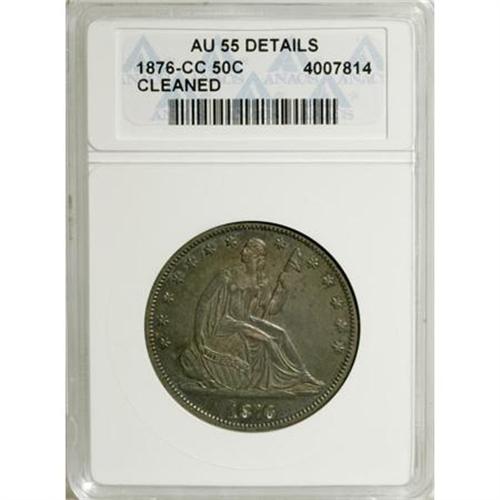 <B>1876-CC 50C --Cleaned--ANACS. AU55 Details.</B></I> NGC Census: (5/84). PCGS Population (14/94). Mintage: 1,956,000. Numismedia Wsl. Price for NGC/PCGS coin in AU55: $350. (#6353)<BR><BR><B>Coin Engraver:</B> Christian Gobrecht<BR><BR><b>Shipping:</b> Coins & Currency (<a target="_blank" href="http://www.heritageauctions.com/common/shipping.php">view shipping information</a>)