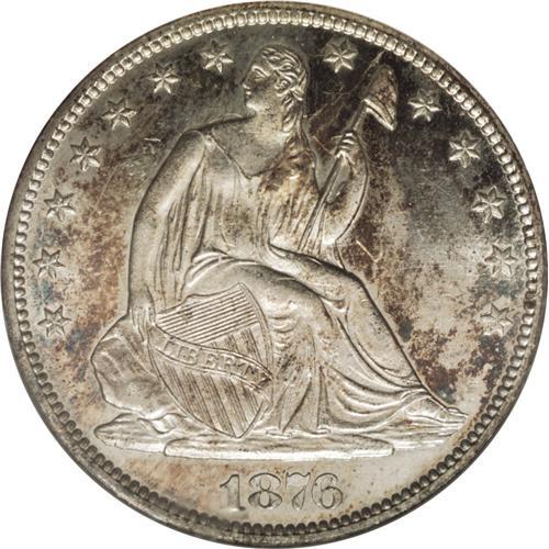 <B>1876-CC 50C MS63 NGC.</B></I> Type One Reverse, with open buds. Unbelievable prooflike fields with moderate die polish lines yield strong cameo-like contrast with frosty motifs. Whispers of iridescent cobalt-blue, lavender, and golden-brown patina further heighten the coin's outstanding eye appeal, as do the boldly defined design elements. Some minor handling marks preclude a higher grade.<BR><BR><b>Shipping:</b> Coins & Currency (<a target="_blank" href="http://www.heritageauctions.com/common/shipping.php">view shipping information</a>)