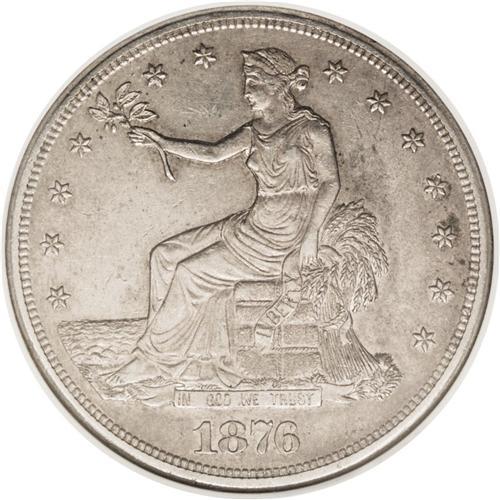 <B>1876-CC<img border='0' src='http://www.heritagecoins.com/images/star.gif' width=10 height=10>$1> Doubled Die Reverse AU58 NGC.</B></I> FS-014. Type One Obverse and Reverse. The unusually wide die doubling is most prominent on the eagle's branch. This tan-gray example lacks obtrusive marks and shows only slight highpoint wear. Luster is subdued across the fields, but brightens legends and devices. Census: 3 in 58, 5 finer (9/06).