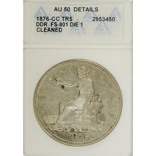 <B>1876-CC S$1 Doubled Die Reverse--Cleaned--ANACS. AU50 Details.</B></I> FS-801, formerly FS-014. Type One Obverse and Reverse. The wide die doubling is most conspicuous on the olive branch above FINE. A pale gray example of this popular Carson City variety. Slightly subdued, but the cleaning is relatively inoffensive.<BR><BR><b>Shipping:</b> Coins & Currency (<a target="_blank" href="http://www.heritageauctions.com/common/shipping.php">view shipping information</a>)