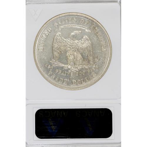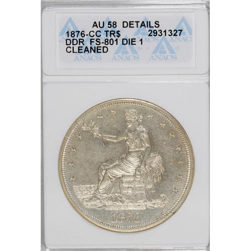 <B>1876-CC S$1 Doubled Die Reverse--Cleaned--ANACS. AU58 Details.</B></I> Type One Obverse and Reverse. FS-801. The doubling is most prominent on the olive branch, the eagle's claws, the right wing tip, the top arrowhead, and markedly on E PLURIBUS UNUM. The recent (and long awaited) Volume II of <I>Cherrypickers' Guide</B></I> comments, "Considered by most to be the strongest reverse doubled die in the series ... thought to be extremely rare in grades above AU." Despite the ANACS caveat, the surfaces are undistracting and attractive, with a light gold cast.<BR><BR><b>Shipping:</b> Coin/Currency (<a target="_blank" href="http://www.heritageauctions.com/common/shipping.php">view shipping information</a>)
