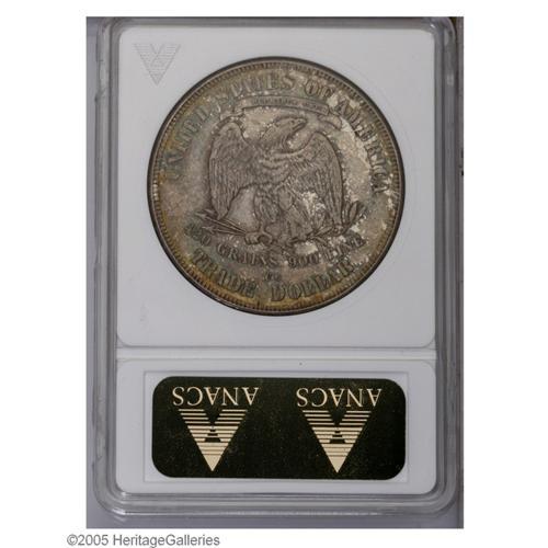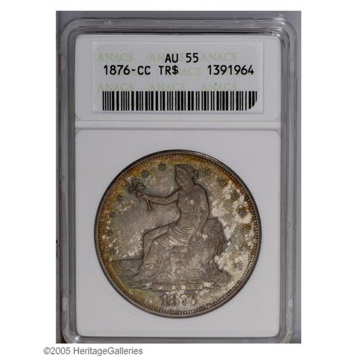 <B>1876-CC<T$1> AU55 ANACS.</B></I> Type One Obverse, Type Two Reverse. Golden-brown, lilac, and aqua colors endow this evenly struck and partly lustrous Carson City Trade Dollar. Not a key date, but certainly scarcer than the 1874-CC and 1875-CC.