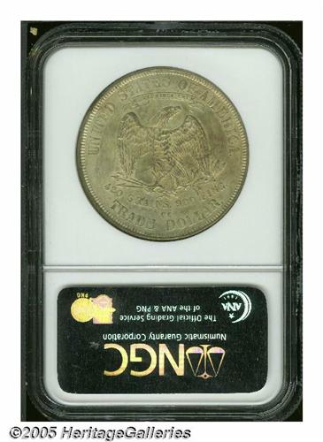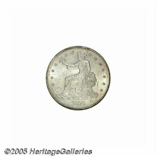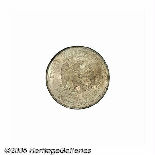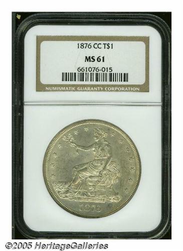<B>1876-CC<T$1> MS61 NGC.</B></I> Type One Obverse / Type Two Reverse. Even though the mintage for the 1876-CC was 509,000 pieces, there are very few Uncirculated pieces known. Coins with any degree of eye appeal are even more difficult. Of the chopmarked 1876-CC dollars that have been examined, Bowers reports that more are known of this obverse / reverse die combination than the Type One Obverse / Type One Reverse. This is a particularly lustrous coin that is sharply defined on each side. The obverse displays only the slightest coloration while the reverse is significantly deeper in hue with much rose-gray patina present. Numerous small to medium sized abrasions explain the MS61 grade. Population: 17 in 61, 22 finer (6/05).