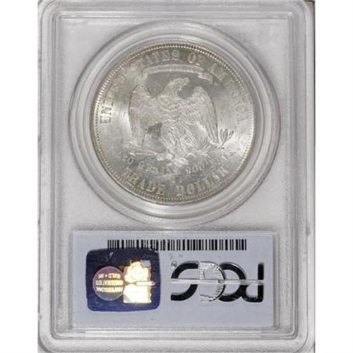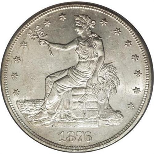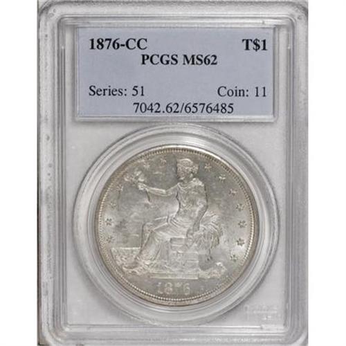 <B>1876-CC T$1 MS62 PCGS.</B></I> Type One Obverse, Type Two Reverse. For the grade, this Trade dollar has a lot of life within it. Very nearly untoned, with plentiful luster and a bold strike that nearly completes Liberty's head on the obverse. Myriad abrasions limit the grade, but the appeal is still considerable. Population: 10 in 62, 5 finer (12/07).<BR><I>From The Rare Coins of New Hampshire Collector Set.</B></I><BR><BR><B>Coin Engraver:</B> William Barber<BR><BR><b>Shipping:</b> Coins & Currency (<a target="_blank" href="http://www.heritageauctions.com/common/shipping.php">view shipping information</a>)