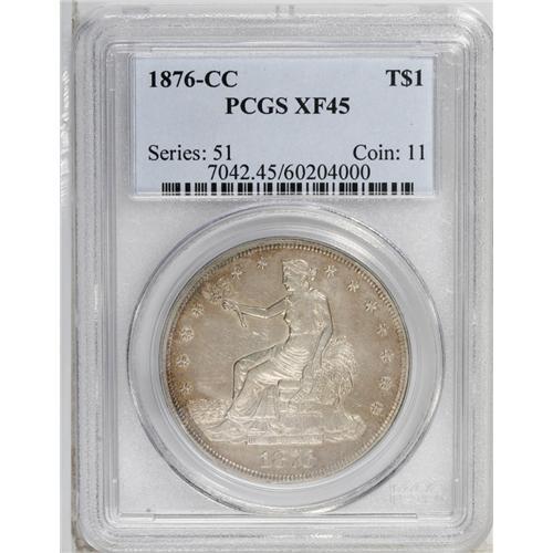 <B>1876-CC T$1 XF45 PCGS.</B></I> Type One Obverse, Type Two Reverse. Breen-5806. Slightly worn with significant original luster. Gold, orange, and red patina adds color to the otherwise pearl-gray surfaces. Population: 12 in 45, 70 finer (10/06).<BR><BR><b>Shipping:</b> Coin/Currency (<a target="_blank" href="http://www.heritageauctions.com/common/shipping.php">view shipping information</a>)