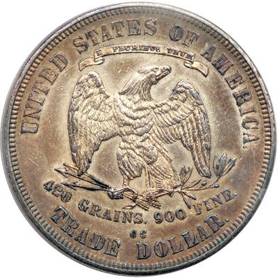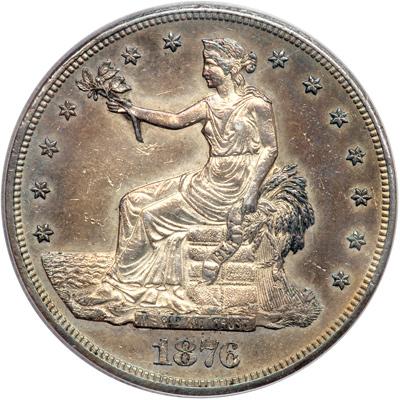 1876-CC Trade Dollar PCGS graded Genuine. Our grade is sharpness of AU58, cleaned and artificially toned. Despite these issues, this is a decent example of a Carson City Trade Dollar (PCGS # 7042) .