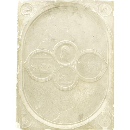 <B>1876 Centennial: A Massive Plaster Plaque Entitled "The National Medallion".</B></I> This beautifully detailed plaque is also found in metal form. The central oval contains the Declaration of Independence text, superimposed over which are 4 relief medallions, one depicting Washington. Four additional medallion imprints with patriotic subjects are found in the corners. Lightly soiled original patina. Chips and flakes of varying degrees of significance around the edge, the largest being at the lower left hand corner. A prime candidate for cleaning and restoration, or displayable as is. Measures 12.25" x 16.5", thickness 1.25".<BR><BR><b>Shipping:</b> Miscellaneous Collectibles, Larg (<a target="_blank" href="http://www.heritageauctions.com/common/shipping.php">view shipping information</a>)