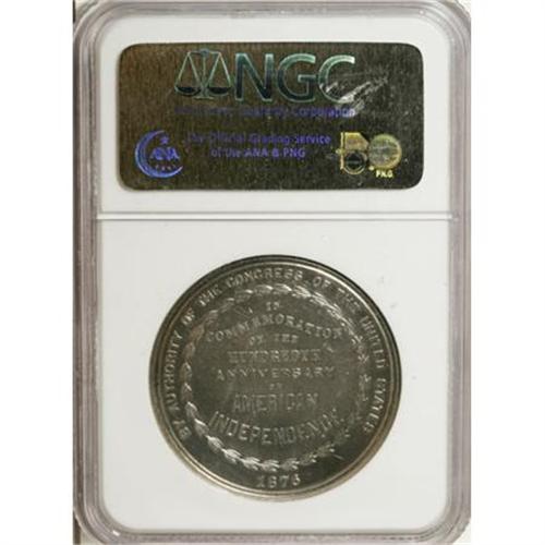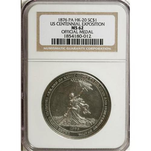 <B>1876 Centennial Exposition, HK-20, MS62 NGC.</B></I> Silver, 38.1 mm. A brilliant Mint State example of this historic Centennial issue, listed as "very scarce" in the HK 1963 reference, with some faint hairlines and light, undistracting contact marks. Priced at $85 in Extremely Fine in HK, more than 40 years ago.<BR><BR><b>Shipping:</b> Coins & Currency (<a target="_blank" href="http://www.heritageauctions.com/common/shipping.php">view shipping information</a>)