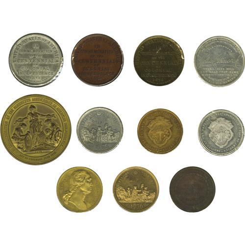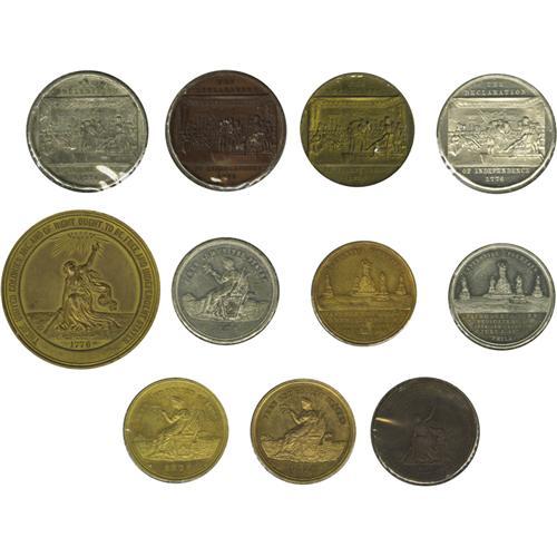 <B>1876 Centennial Exposition - Philadelphia So-Called Dollars.</B></I> Official exposition medals produced by the United States Mint: HK 21 Julian CM-10 (VF); Larger size Julian CM-11 (AU); HK 54 George Washington / Seated Liberty (UNC); HK 58 Continental Soldier / Seated Liberty (UNC); HK 59 same WM (AU); HK 69 Fountains / Catholic Abstinence Union (UNC); HK 70 same WM (UNC); HK 74 Signing of Declaration of Independence (VF); HK 74A same, bronze, unlisted in this composition (UNC); HK 74B brass, unlisted in this composition (UNC); HK 74C, white metal, unlisted reverse featuring large John Hancock signature (UNC). 11 pieces.