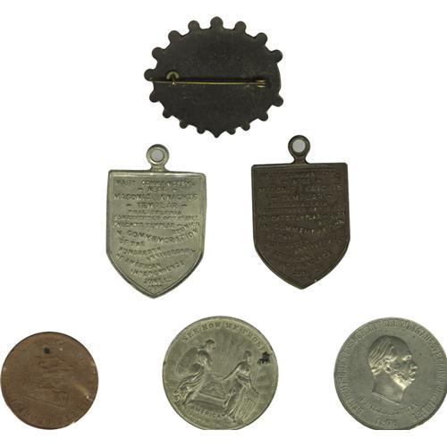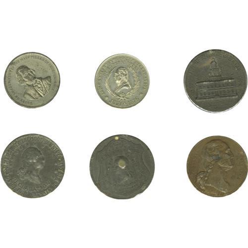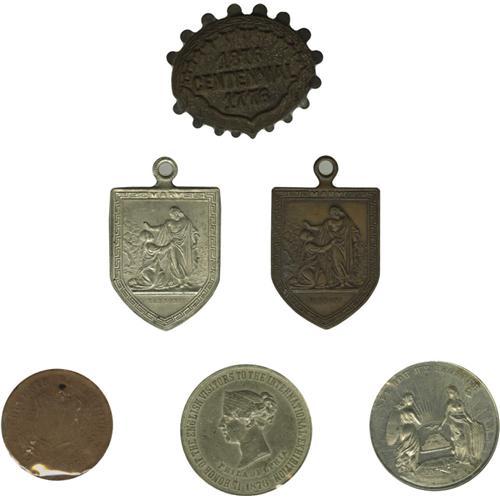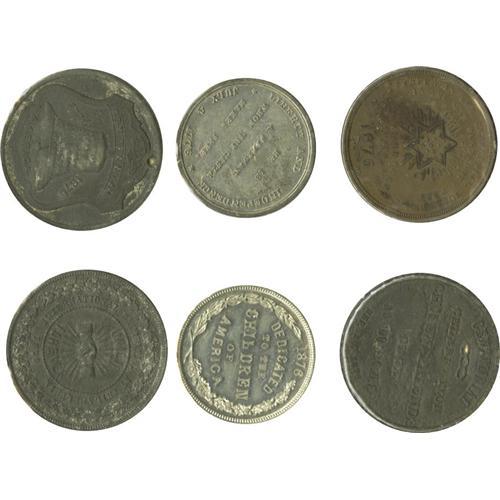 <B>1876 Centennial Exposition Philadelphia So-Called Dollars and Related Medals.</B></I> HK 46 Independence Hall (White Metal, XF); Unlisted muling reverse HK 49/ Reverse HK 60. George Washington / Star and Rays (Bronze, XF); HK 114, Dewitt C (Confederate) 1861-4 George Washington / He is a Freeman Whom the Truth Makes Free, scarce. (White metal, AU); HK 117 George Washington (white metal, AU); HK unlisted, Baker 398 George Washington portrait on shield / Liberty Bell on shield. This very rare medal is only known in white metal and is rated R9 on the current Washingtonia catalog (XF); HK unlisted Baker 425C G. Washington / Handshake (white metal, XF); HK unlisted, portrait Queen Victoria in honor of English visitors / Europe-America allegorical scene (white metal, XF); portrait German Kaiser - German inscription honoring German visitors to exposition, (white metal, UNC); Reunion Masonic Knights Templar (at expo) shield shape with loop (bronze, Au); same (white metal, UNC); Vulcanite pinback, 1876/Centennial/1776 (XF); Unusual red fiber medal with legends in French- "Amulette Odoriferante de Perse" (XF, holed). 12 pieces.