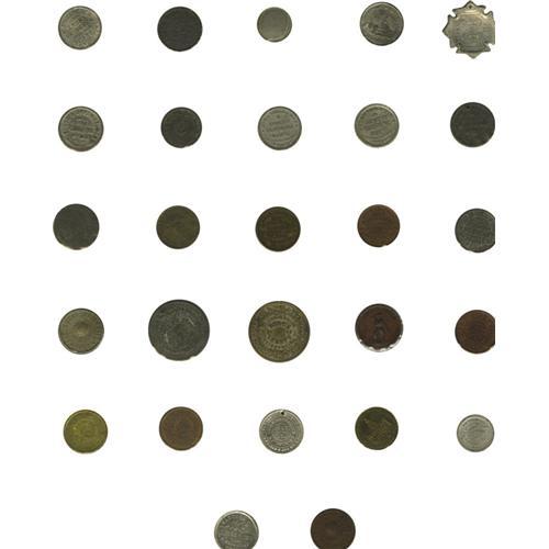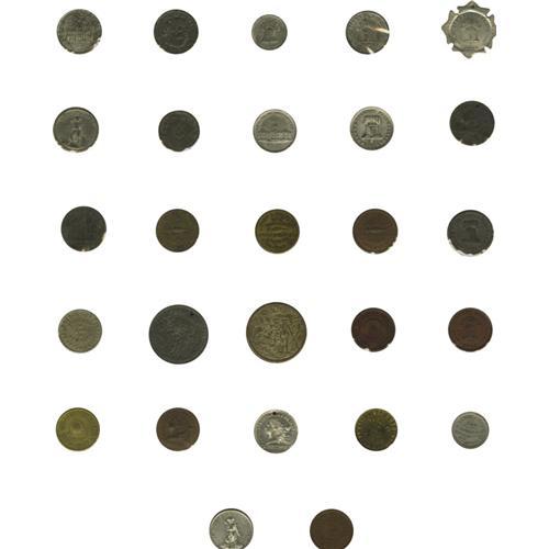 <B>1876 Centennial Philadelphia Storecards.</B></I> Lingg & Bro. (10 varieties including 2 dated 1882, 2 -VF, balance UNC, 2 holed); Pfaelzer Brothers (UNC); Jacob Reed (UNC); Jacob Reed's Sons (VF); John G. Schmidt (3 total -2 XF, UNC); C.B. Scott & Co. (XF); Simon & Oppenheimer (VF); S.H. Smith (VF); John Stilz & Son (3 total -2 XF, fine holed); A.J. Weidener (XF); Yates & Co. (XF); 3 mulings with no merchant advertising. (UNC, holed; 2 VF). Five bronze, five brass, white metal. Stock reverses include: Continental Soldier, <I>Libertas Americana,</B></I> Independence Hall, Liberty Bell, Capitol at Washington, and double head. 27 pieces.
