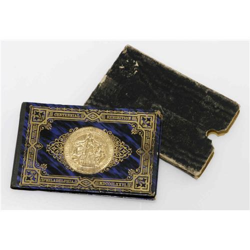 <B>1876 Centennial Souvenir Booklet.</B></I> A handsome blue and gold booklet with a simulated gold Centennial medallion on the front and back covers. The book contains twelve photographs (which aren't actually photographs) and was manufactured by the Philip Fray Company. The inside back cover has a fold-out map of the Centennial grounds. The first we've seen. Certainly scarce and quite rare.