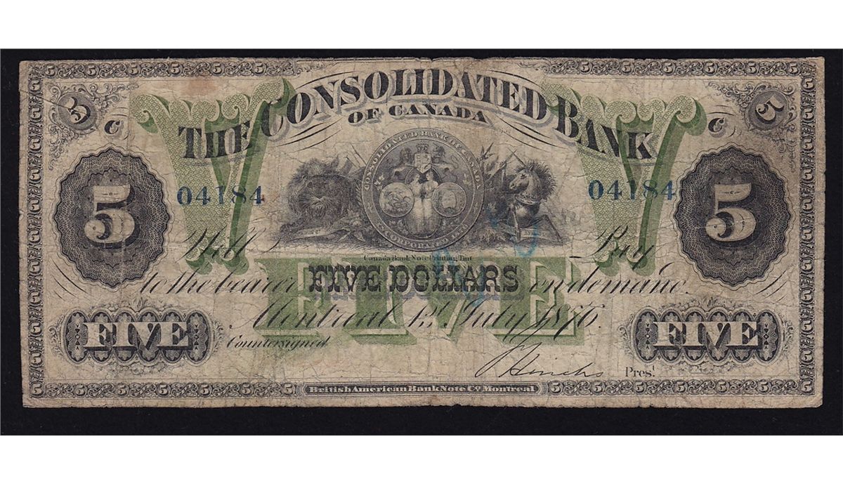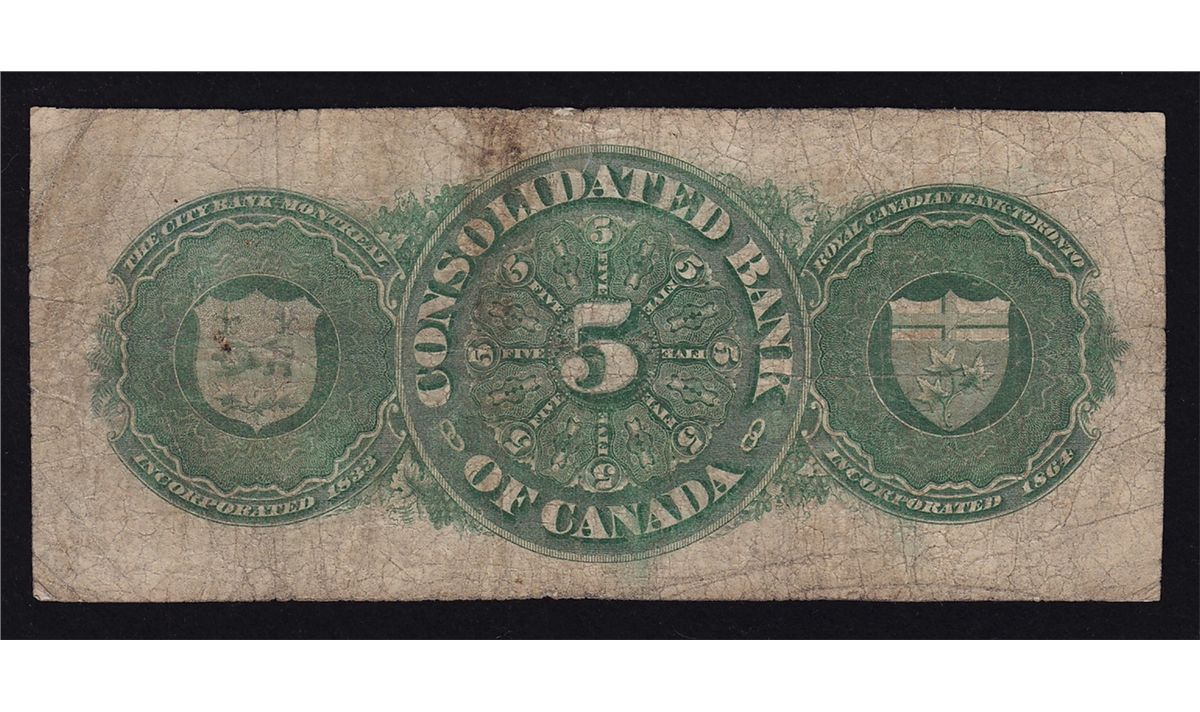 1876 Consolidated Bank $5 - CH 205-10-04, Small repair at top on back, otherwise Fine. Rare with only 8 known. Crayon on front, S/N:04184/C.
