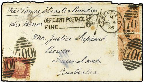 1876 Destination mail envelope to AUSTRALIA bearing 1 d red (SG 43) and 4 d vermilion (pair) (SG 95) tied by SHEFFIELD duplex, endorsed "Via Torres Straits & Brindisi" with handstruck instructional DEFICIENT POSTAGE 9d/FINE 6d=1/3 and BOWDEN arrival on reverse. Very fine item.