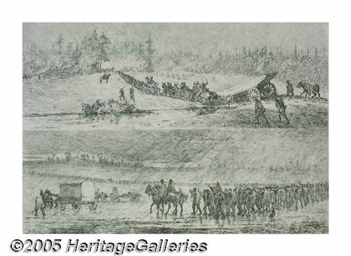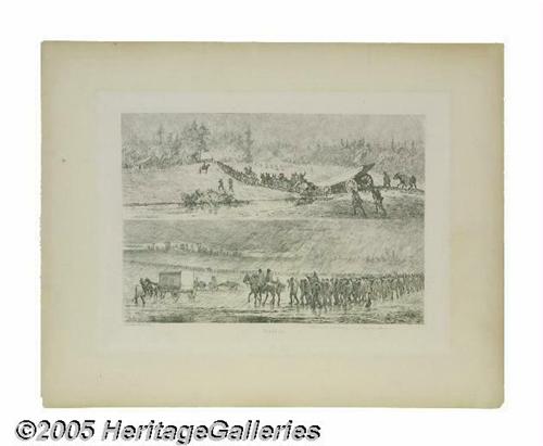 <B>1876 Edwin Forbes Etching "Stuck in the Mud"</B></I> Born in New York City, Edwin Austin Forbes became a Civil War artist for <I>Leslie's Illustrated,</B></I> joining the staff at age 22 in 1861. He was attached to the Army of the Potomac, and was one of the youngest and one of the few artists who covered the entire war. Most of his illustrations were of the daily life of the soldiers, but he also depicted battle scenes including the Second Battle of Bull Run. Here is Plate 19 from his "<I>Life Studies of the Great Army</B></I>" published in 1876. Titled <I>Stuck in the Mud... A Flank March Across Country During a Thunder Shower,</B></I> this print shows a pontoon wagon with boat stuck in a slough. A regiment of infantry is pulling on a rope, trying to drag them to higher ground. Etching size is 15. 1/2" x 11", matted to an overall size of 26" x 20". Very fine condition. Lot:251