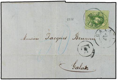 1876 Envelope to GALATZ, Rumania from Sistov Bulgaria bearing D.D.S.G. 10 Kr green (Yvert 3) tied by SISTOV datestamp in blue, underpaid with tax hand-stamp and GALATZ double ring arrival. Unusual item.