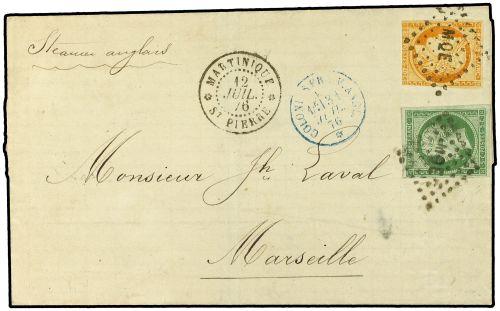 1876 Envelope to MARSEILLE bearing French General Colonies 40 c orange (Yvert 13) mixed with French Napoleon 5 c green (Yvert 12) tied by dotted MQE in lozange with adjacent ST. PIERRE datestamp, sent by British packet with French entry cachet in blue and arrival on reverse. Very rare mixed combination.