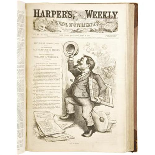 <B>1876 Full Year Bound Volume of <I>Harper's Weekly</B></I>.</B></I> Published weekly between January 1 and December 30, 1876 by Harper & Brothers. Elephant folio (11.5" x 16.25"), 1,068 pages. Centerfolds bound-in. For the collector hungry for <I>Harper's Weekly,</B></I> this 1876 collection is a veritable feast, with every weekly issue and supplement bound together in sturdy hardcover. 1876 was a busy year for both the United States and the popular magazine, with events such as the American Centennial Exposition in Philadelphia, the presidential election of Rutherford B. Hayes, and the capture of William "Boss" Tweed in Spain. This latter event is especially apropos to readers of <I>Harper's Weekly.</B></I> Boss Tweed's Tammany Hall organization in New York City was perhaps the most corrupt political organization in American history, and his downfall can be directly attributed to Thomas Nast's illustrations of him in <I>Harper's Weekly.</B></I> Tweed despised Nast's <I>Harper's Weekly</B></I> illustrations, and was once reportedly heard to exclaim, "Stop them damned pictures. I don't care so much what the papers say about me. My constituents can't read, but, damn it, they can see pictures!" When Tweed escaped the United States, then bribed his way out of Cuba and headed for Spain, he thought he would be safe there. Apparently, though, Tweed's constituents weren't the only ones who "can see pictures." Legend has it that the Spanish authorities, tipped off by the U. S. government, used Nast's <I>Harper's Weekly</B></I> illustrations to help recognize Tweed upon his arrival. They arrested him and shortly sent him back to America, where he died in jail two years later. This bound volume of <I>Harper's Weekly</B></I> contains 33 Thomas Nast covers, including numerous internal Nast wood-cut illustrations on a variety of subjects. Other artists featured in these pages include A. B. Frost, Julian Scott, W. M. Cary, and scores more. The volume is in very good condition, with light toning to the pages, a few pages with minor tears, and two pages toward the end of the volume disbound. Still, rare is the chance to obtain an entire year of <I>Harper's Weekly</B></I> in one place, especially in such good condition.<BR><BR><b>Shipping:</b> Books & Catalogs (<a target="_blank" href="http://www.heritageauctions.com/common/shipping.php">view shipping information</a>)