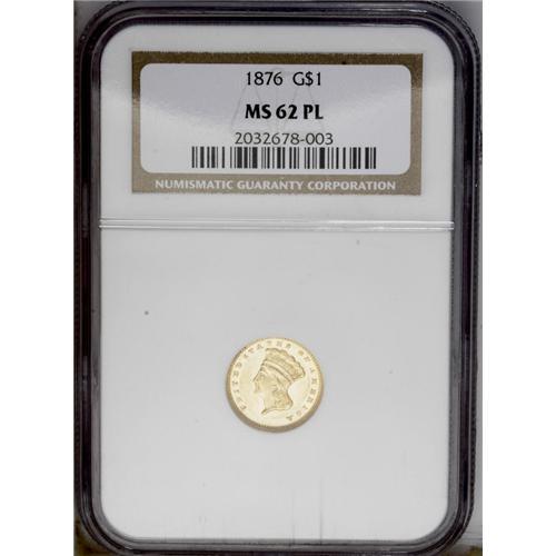 <B>1876<G$1> MS62 Prooflike NGC.</B></I> Bright prooflike surfaces reveal wispy slide marks on Liberty's cheekbone. Nicely struck, with no significant abrasions. Census: 3 in 62 Prooflike, 6 finer (4/06).