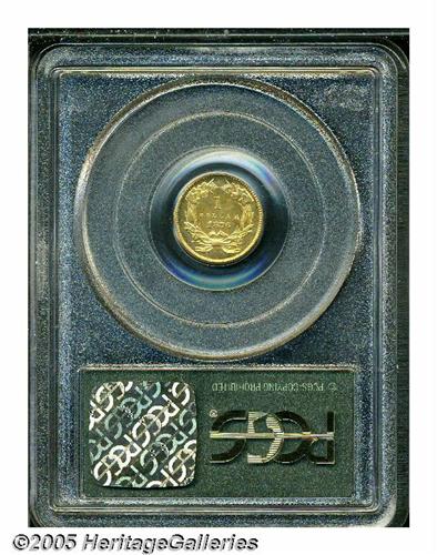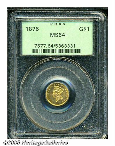 <B>1876<G$1> MS64 PCGS.</B></I> Sharply struck with dark reflective fields and mildly frosted devices. A well preserved and pleasing better date Gold Dollar. A mere 3,200 pieces were struck for this Centennial issue. Certified in a green label holder. Population: 29 in 64, 12 finer (5/05).