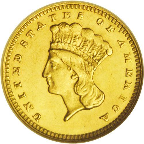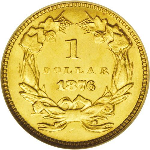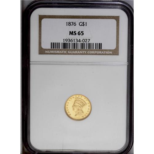 <B>1876<G$1> MS65 NGC.</B></I> A flashy Gem with partially reflective and wholly original lemon-orange surfaces with only a few tiny marks. A conditionally rare and exceedingly desirable piece from a mintage of only 3,245 examples. Population: 10 in 65, 2 finer (7/06).<BR><I>From The Derrick Snider Collection.</B></I>