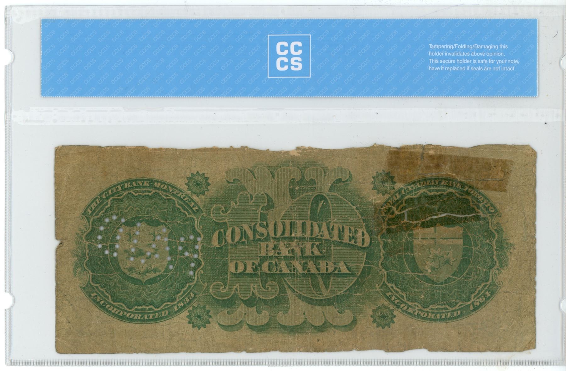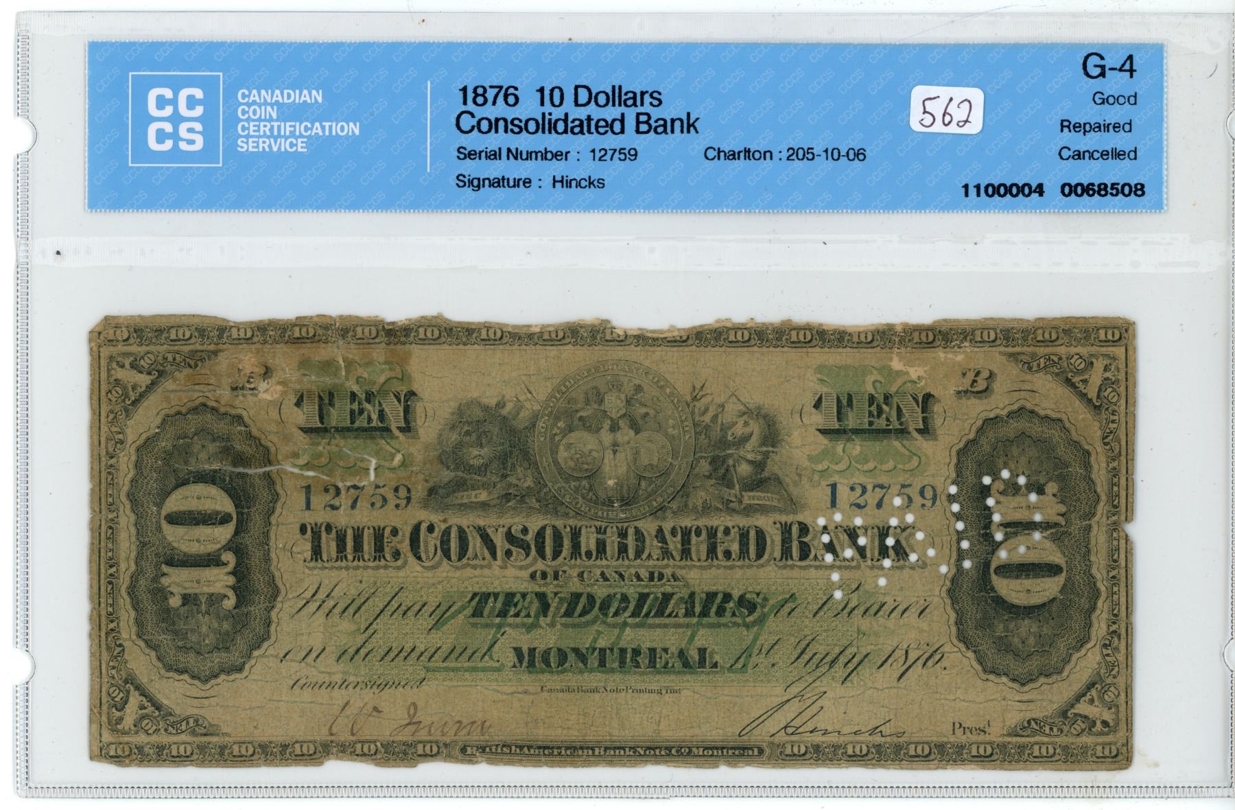 1876 Graded CCCS "Consolidated Bank" Canadian 10 dollar bank note - 12759 - G4
