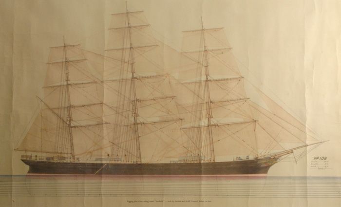 A framed, large and detailed rigging plan produced by Harland and Wolff for during the construction of the Steelfield sailing ship for R.C. McNaughton & Co.