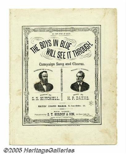 <B>1876 Hayes and Wheeler Campaign Sheet Music</B></I> Titled <I>The Boys in Blue Will See It Through,</B></I> this "Campaign Song and Chorus" has jugate engraved portraits of Rutherford B. Hayes and William Wheeler and is dedicated "to the boys in blue." The song was written by S. N. Mitchell and H. P. Danks and copyrighted 1876 by S. T. Gordon & Son of New York. Six pages, fine condition with some foxing and roughness on right edge, 10.5" x 14". Lot:259