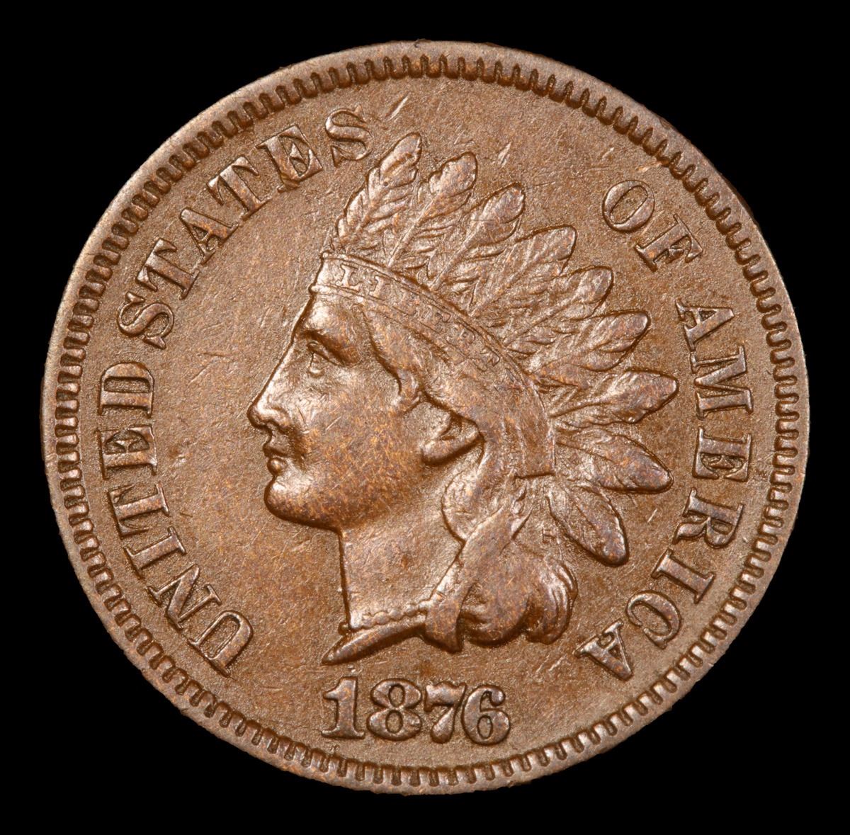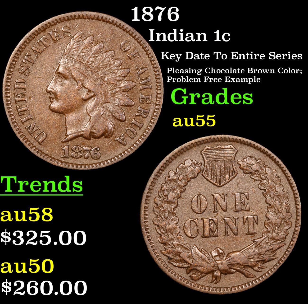 1876 Key Date To Entire Series Pleasing Chocolate Brown Color; Problem Free Example Indian Cent 1c Grades Choice AU. very scarce date. PCGS estimates that only 5000 survive in all grades