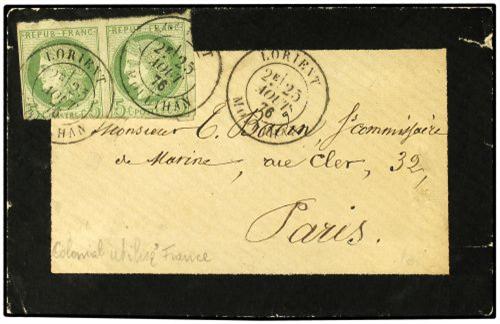 1876 Mourning envelope to FRANCE bearing French General Colonies 5 c green (imperf pair) (Yvert 17) tied by LORIENT MORBIHAN double ring with PARIS arrival on reverse. The use of French Colony stamps in France is rare.