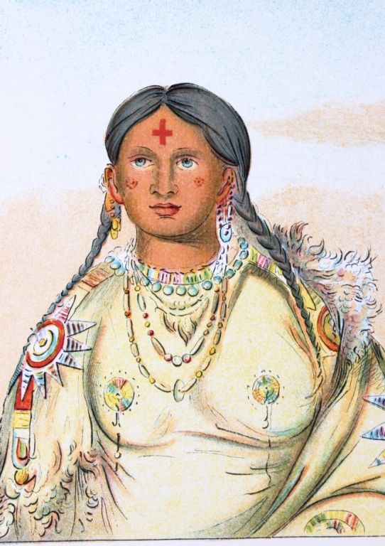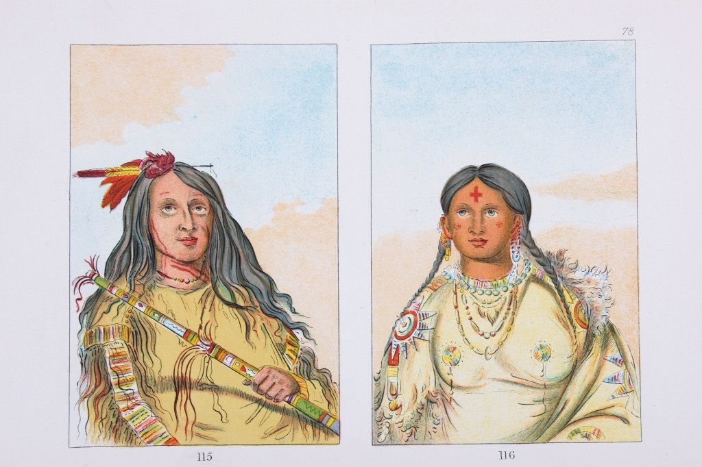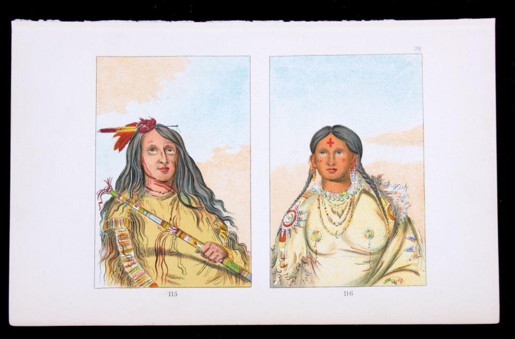 This is an original work of art colored engraving by George Catlin (1796-1882) from the, "Illustrations of the Manners, Customs, & Conditions of the North Ameircan Indians with letters and notes, Written during EightYears fo Travel and Adventure Among the Wildest and most Remarkable Tribes Now Existing. by George Catlin." This was printed in London by Chatto & Windus, Piccadilly 1876. The engraving shows plate number 115 &116 both showing Native American women in beaded shirts having a portrait style. The entire page measures 6 3/8"x9 7/8" George Catlin was the first artist to observe the tribes of the Plains Indians and toillustrate their habits and customs from first-hand observation. His belief in the "noble savage", unspoiled by contact with the outside world, sustained him as he crossed and re-crossed the country - from theMississippi to the Rockies - gathering raw material for his Indian Gallery.