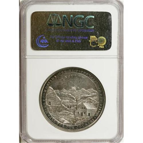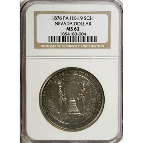 <B>1876 Nevada Silver, HK-19, MS62 NGC.</B></I> Silver, 38.1 mm, "rare" in HK. A lustrous Mint State piece, fairly prooflike and with a touch of gold toning on the obverse rim. Apparently physics was not Chief Engraver William Barber's strong suit. In the mining scene on the reverse, steam from a train blows in one direction, while smoke from a nearby chimney blows in the opposite direction. A nice example of this elusive issue, seldom seen in higher grade. Census: 5 in 62, 3 finer (8/07).<BR><BR><b>Shipping:</b> Coins & Currency (<a target="_blank" href="http://www.heritageauctions.com/common/shipping.php">view shipping information</a>)
