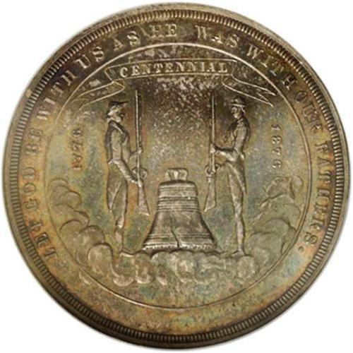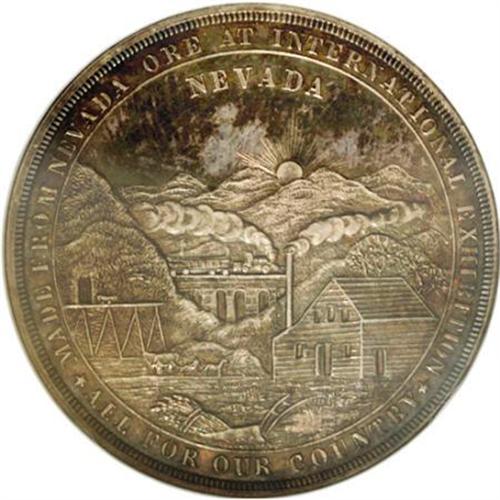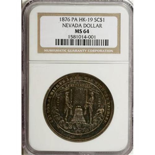 <B>1876 Nevada So-Called Dollar, HK-19, MS64 NGC.</B></I> This is one of the scarcest of the so-called dollars, listed as "rare" in the 1963 Hibler-Kappen reference. There were a total of only 2,526 pieces struck from Nevada ore at the U.S. Mint in Philadelphia, sold at the Nevada building on the grounds of the U.S. Centennial Exposition in 1876. The piece exhibits an overall blue-green patina with just a hint of red. A wonderful piece that would enhance anyone's so-called dollar collection.<BR><BR><b>Shipping:</b> Coins & Currency (<a target="_blank" href="http://www.heritageauctions.com/common/shipping.php">view shipping information</a>)