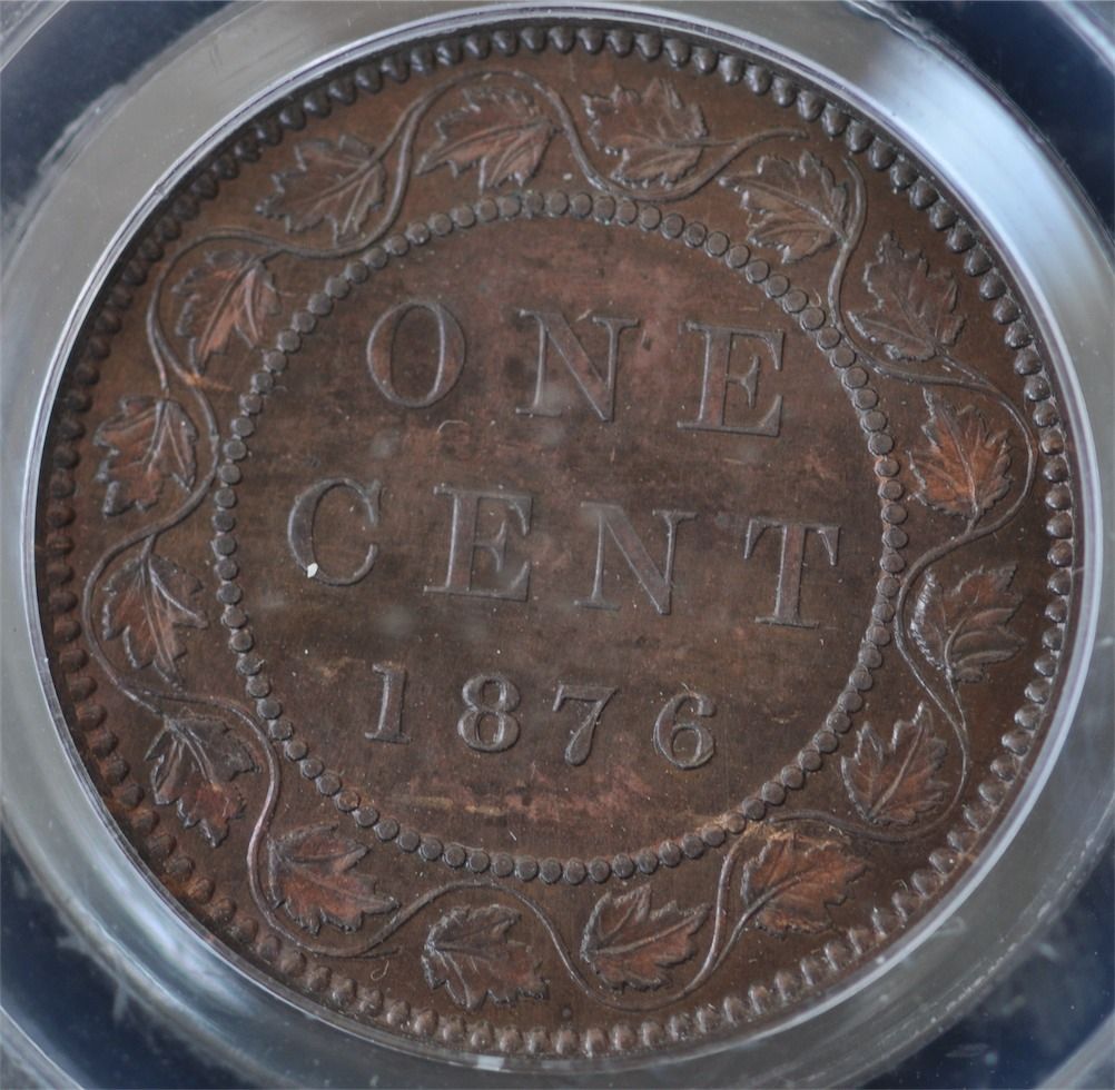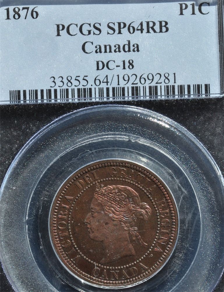 1876 One Cent Specimen - CH DC-18, PCGS SP64 Reddish-brown. The first-year issue of the new obverse type. Very few Specimen strikes were produced and this is the only piece we've been able to locate without the H mint mark (produced by the Heaton Mint). 7 coins graded by PCGS.