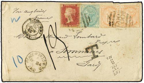 1876 PONCE a FRANCIA. Circulada con sellos Britanicos de 1 p. rojo, 4 p. naranja (2) y 1 sh. verde, mat. F-88 de la B.P.O. de Ponce y fechador al lado PONCE-PORTO RICO/PAID. Tasada a la llegada con "13" (decimas). Excepcional franqueo.