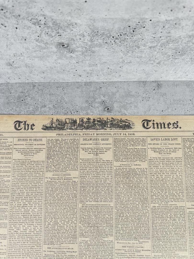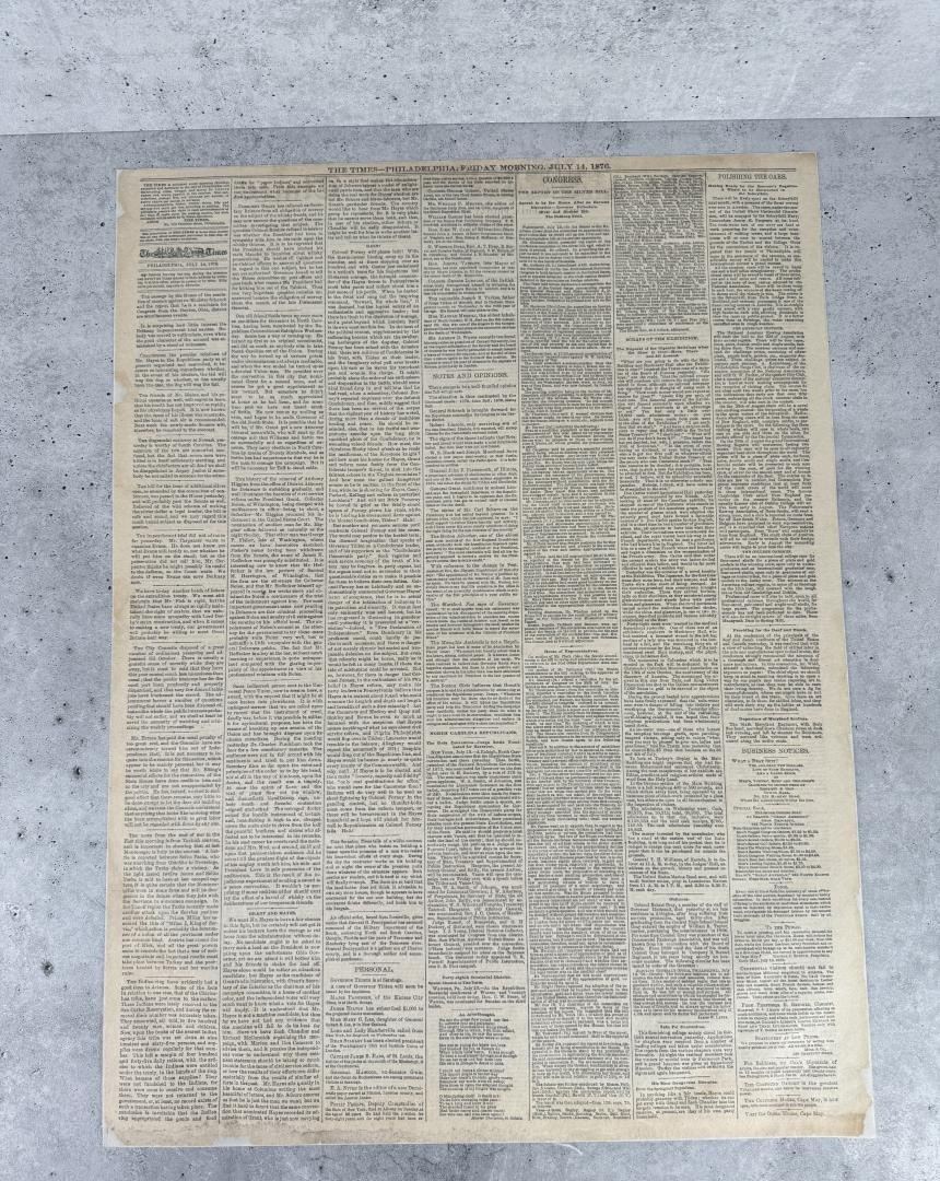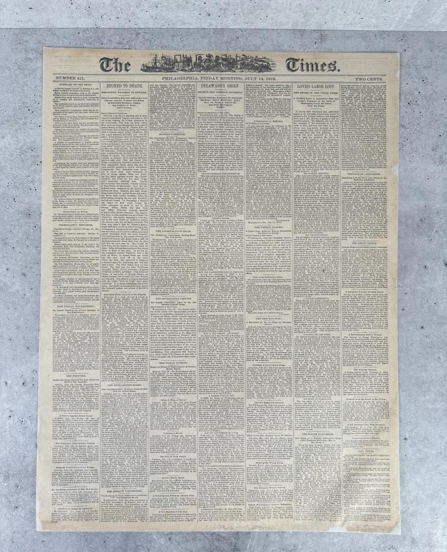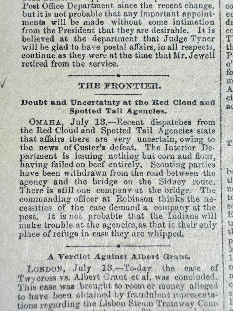 Newspaper date is July 14 1876. Custer was killed on June 26, 1876, but the news of the battle didn't reach the East for several days. The first reports of the battle began to appear on July 6th.
