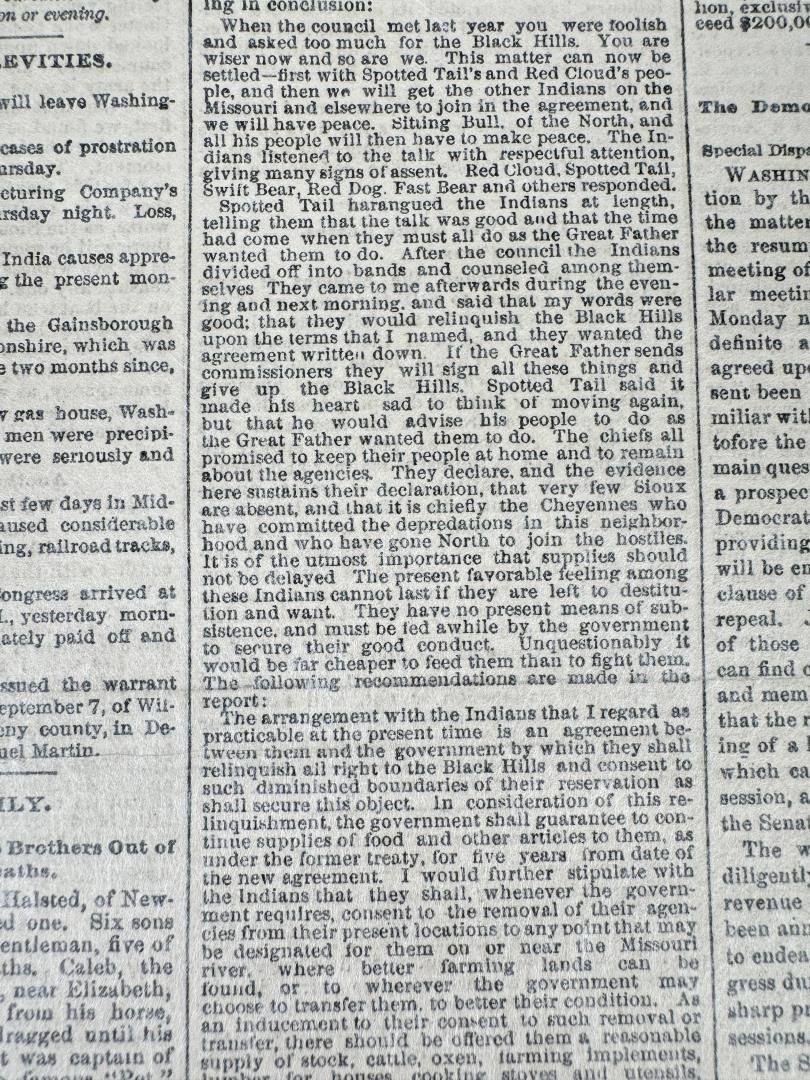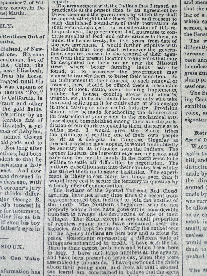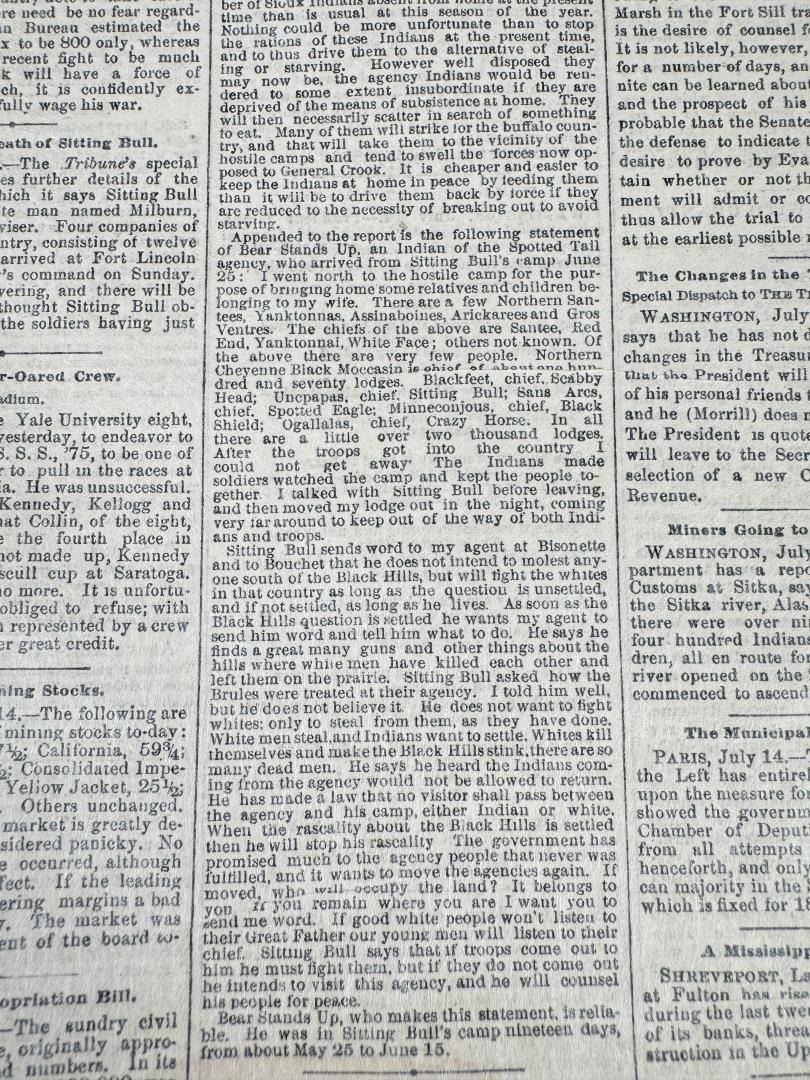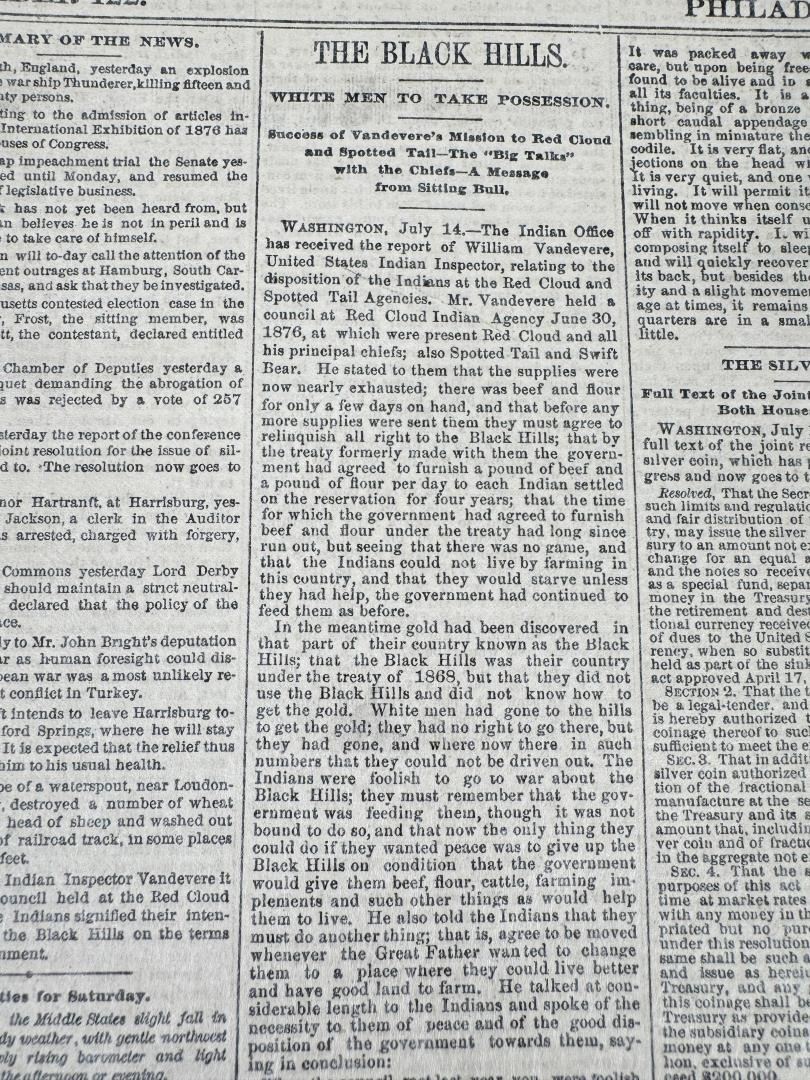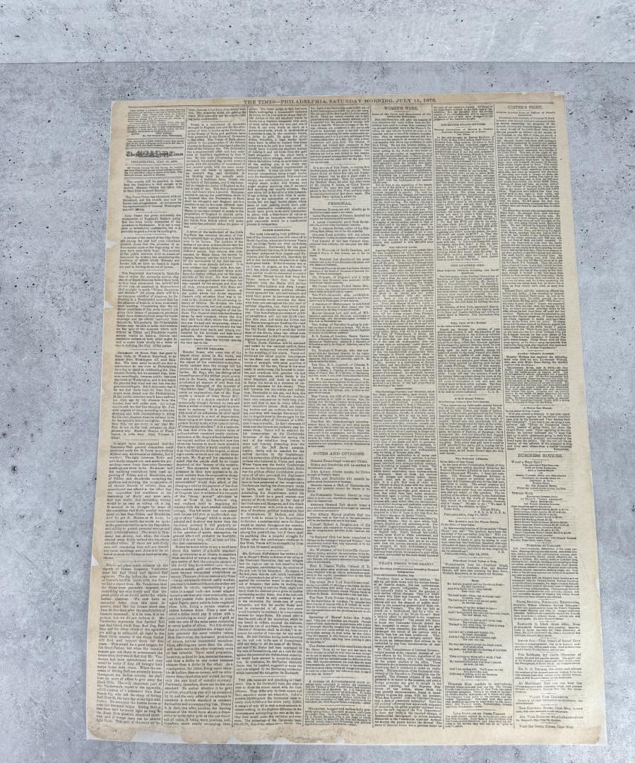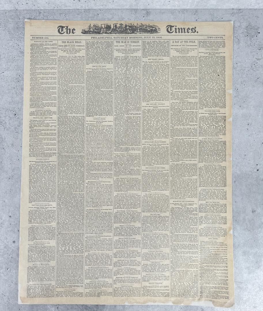Newspaper date is July 15 1876. Custer was killed on June 26, 1876, but the news of the battle didn't reach the East for several days. The first reports of the battle began to appear on July 6th.