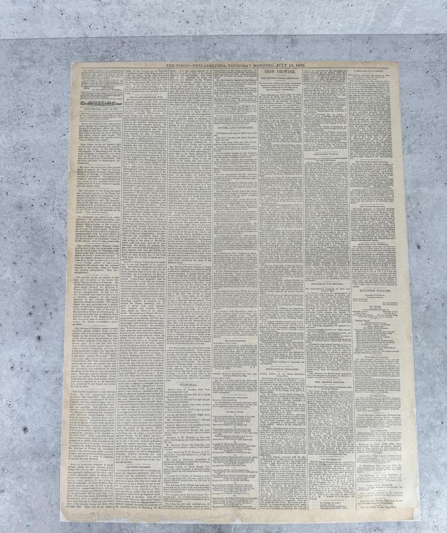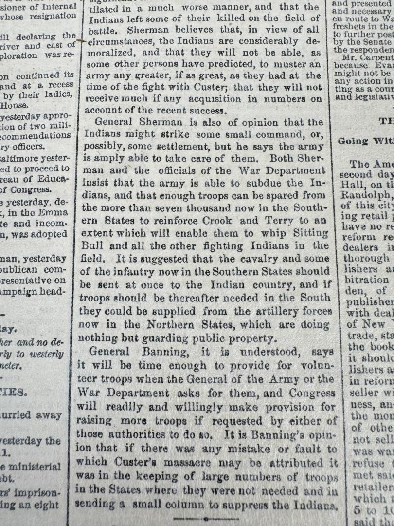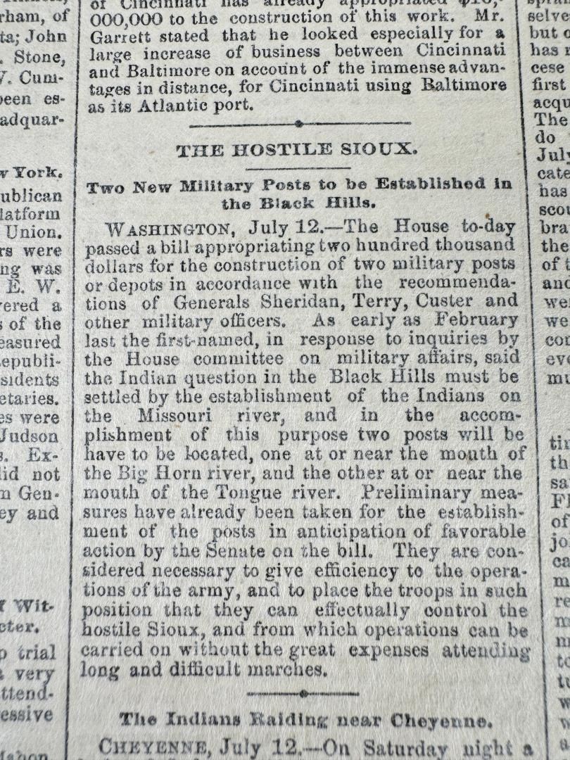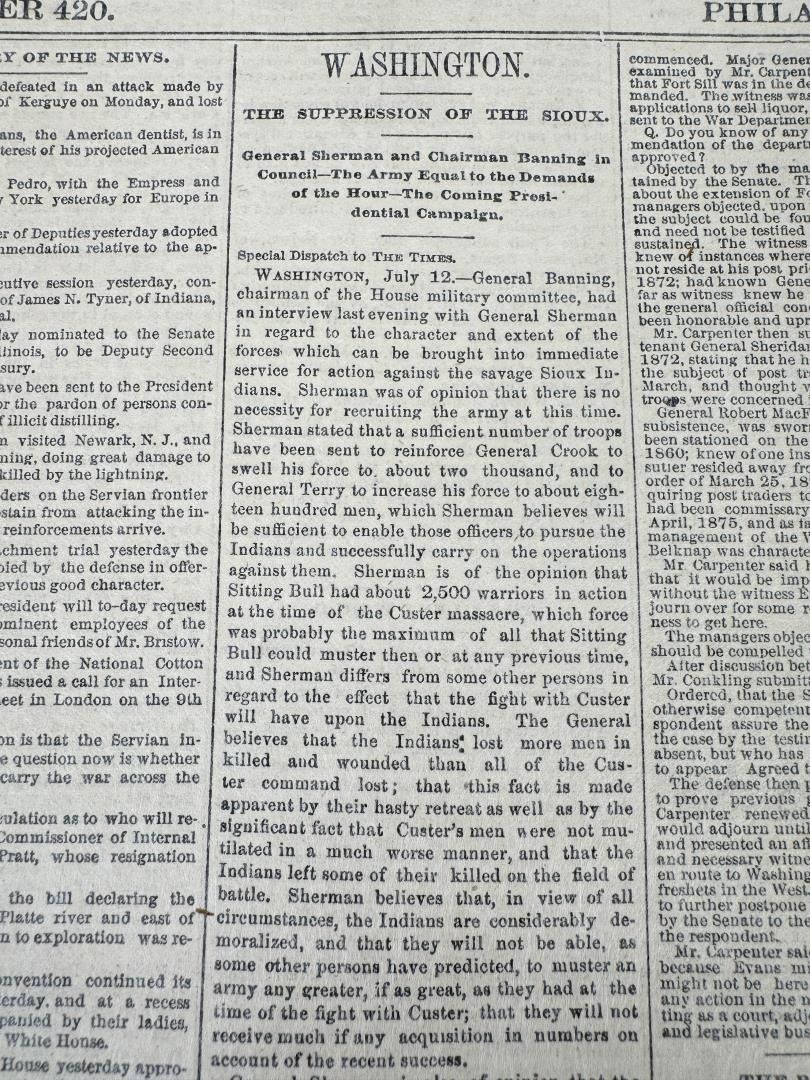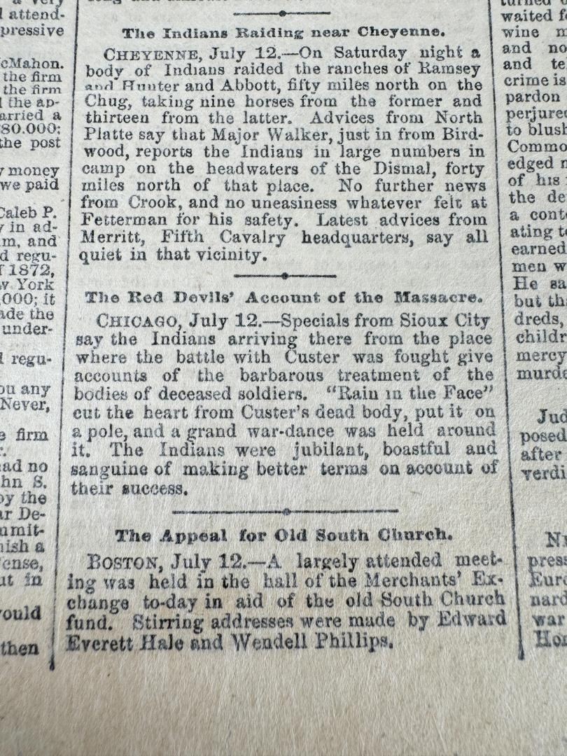 Newspaper date is July 13 1876. Custer was killed on June 26, 1876, but the news of the battle didn't reach the East for several days. The first reports of the battle began to appear on July 6th.