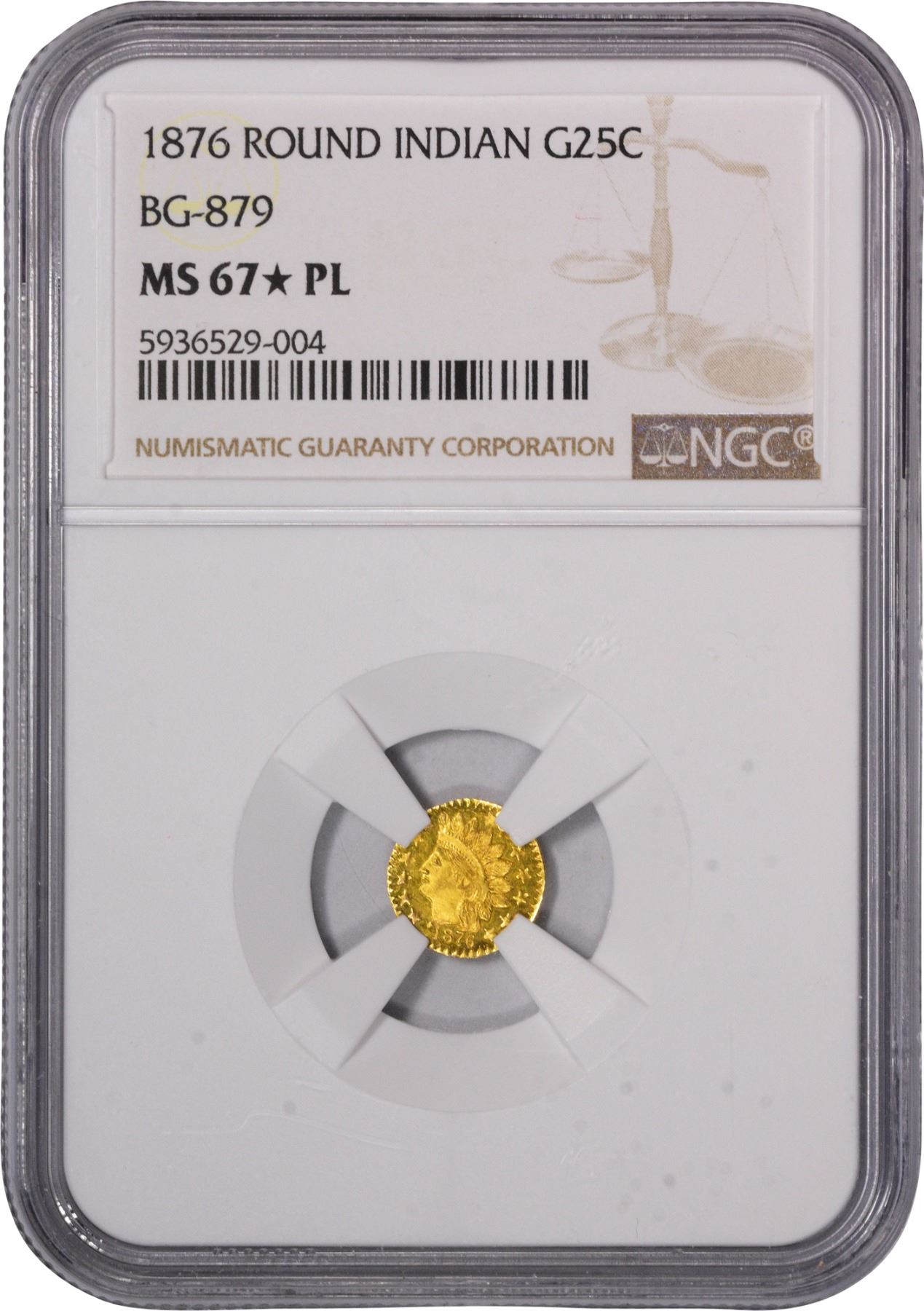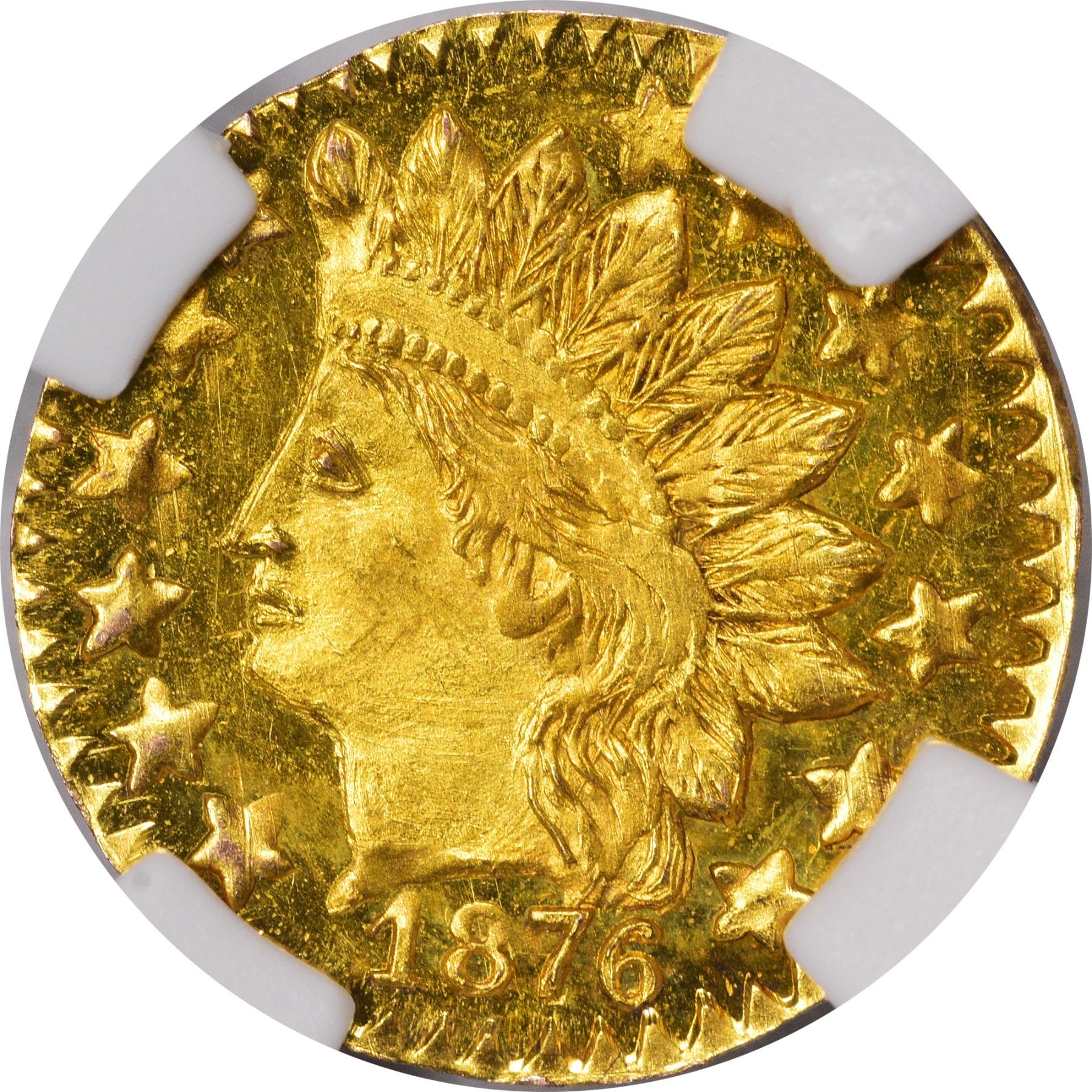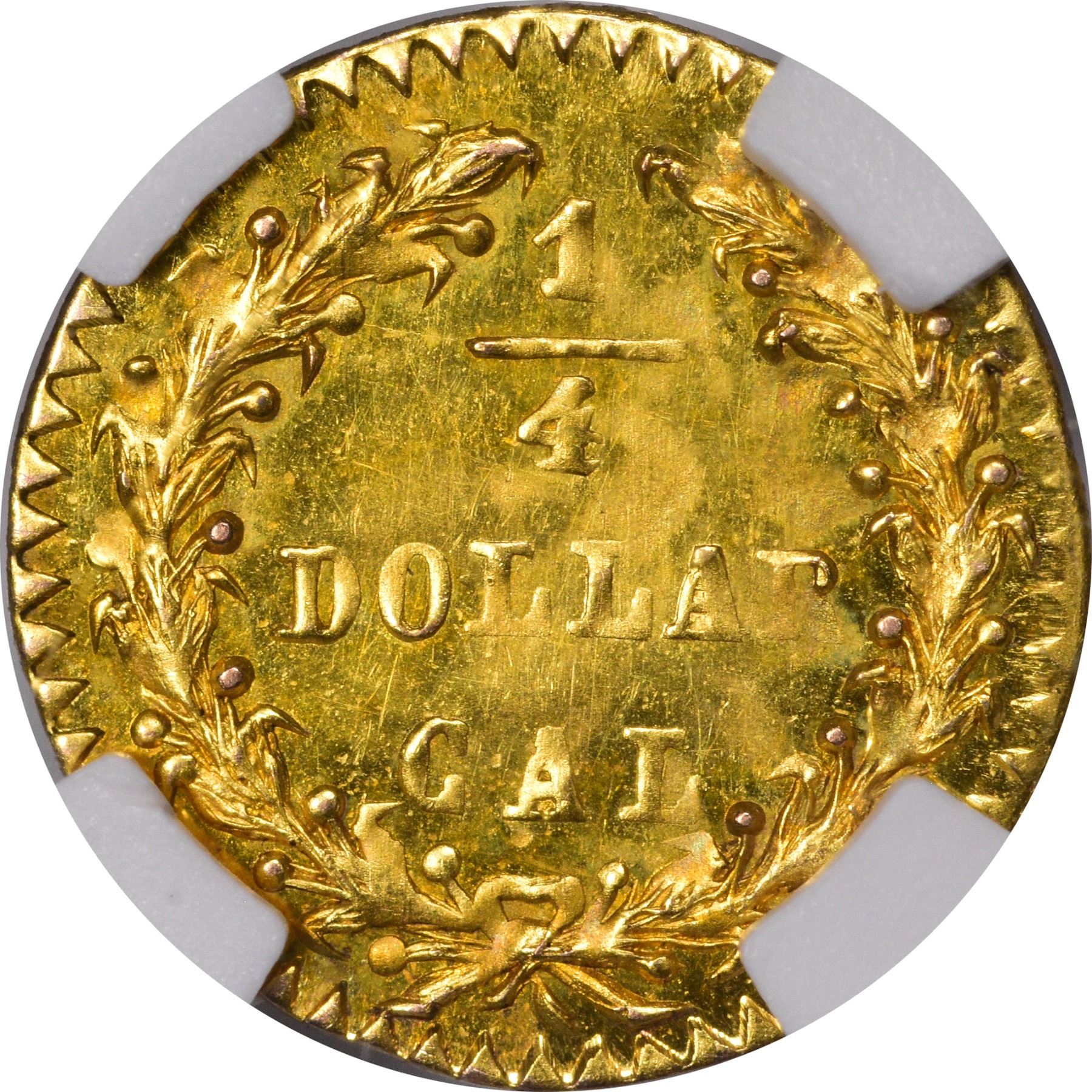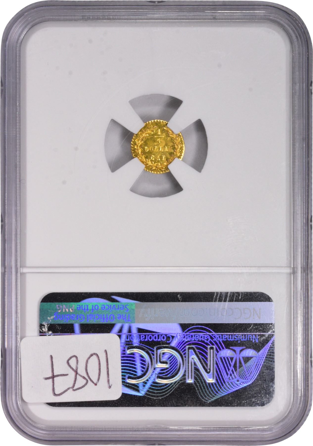 Undoubtedly one of the highlights of this grand California Fractional Gold offering, the present coin’s grade implies superior quality, and it readily measures up! Bright yellow surfaces afford a wisp of olive iridescence here and there, and the devices are needle-sharp. Beautiful! Period Two. Christopher Mohrig.