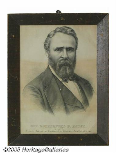 <B>1876 Rutherford B. Hayes Campaign Print by Currier and Ives</B></I> "National Republican Candidate for President of the United States." Minor age browning, one fine two inch tear and one fine corner crease. Very decent overall appearance, in original frame. 12.5" x 16.5" as framed. Lot:259